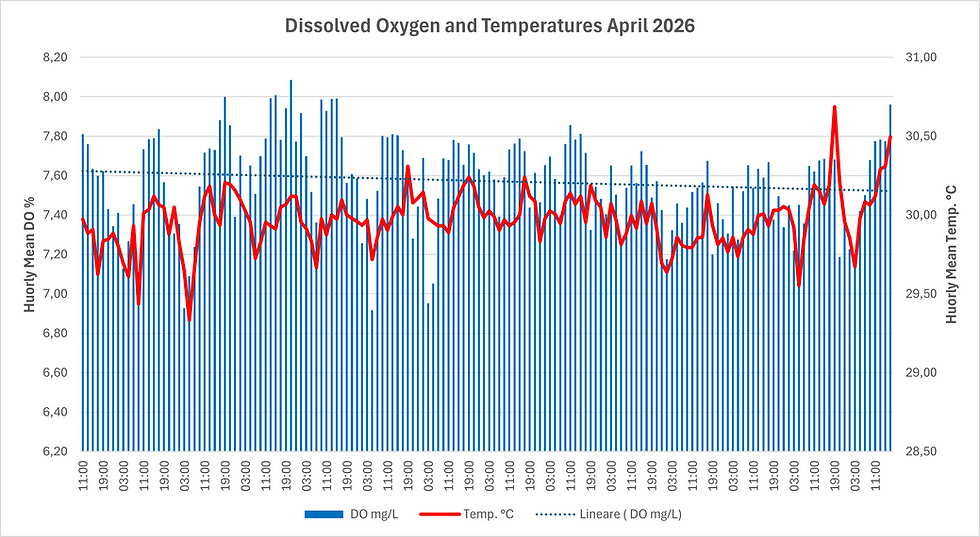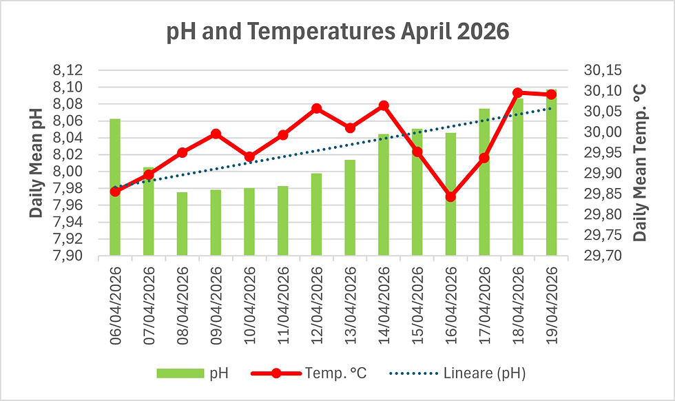 In April 2026 the reef revealed its heartbeat through three vital signs: pH, dissolved oxygen, and temperature. Taken together, the five graphs show both the calm of daily averages and the hidden rhythms of two‑hour cycles.